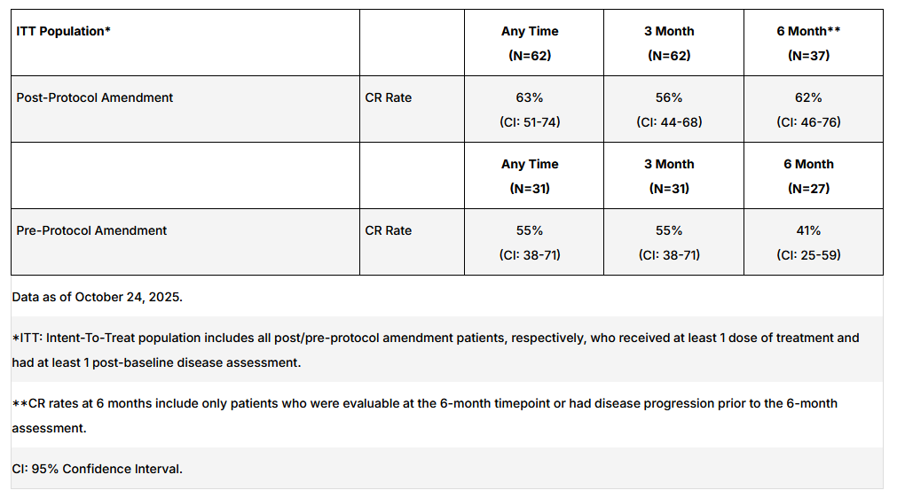 The preliminary analysis included 62 patients at 3 months and 37 patients at 6 months. All patients included in this analysis were evaluated under LEGEND’s amended protocol, which went into effect in the fourth quarter of 2024, and was designed to more closely align the LEGEND trial with the American Urological Association’s Guidelines and standard of care.