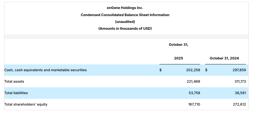BOSTON & MONTREAL – enGene Holdings Inc. (Nasdaq: ENGN, “enGene” or the “Company”), a clinical-stage, non-viral genetic medicines company, today announced its financial results for the full year ended October 31, 2025, and provided a business update.