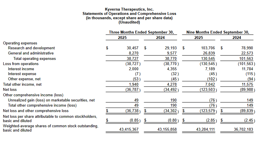 Kyverna reported $171.1 million in cash, cash equivalents, and marketable securities as of September 30, 2025. Including the initial $25 million drawn from the loan facility in November 2025, the Company expects to have a cash runway into 2027, supporting its BLA filing for SPS and its Phase 3 gMG trial, while also accelerating pre-launch activities.