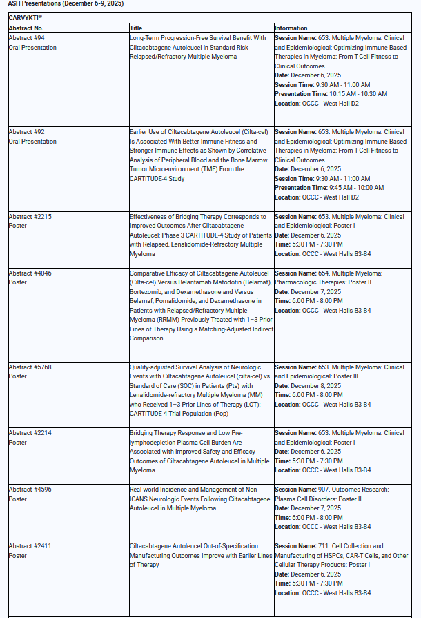 “We’re proud to see the depth and breadth of data being presented at ASH this year, reflecting the continued innovation and clinical impact of our cell therapy programs,” said Ying Huang, Ph.D., Chief Executive Officer of Legend Biotech. “With eight abstracts highlighting CARVYKTI, these presentations further demonstrate the durability of responses, evolving safety profile, and real-world outcomes that support the potential of CAR-T therapy earlier in the multiple myeloma treatment journey. In addition, our first-in-human data on Lucar-G39D highlights our ongoing efforts to expand our pipeline into next-generation allogeneic cell therapies for patients with B-cell malignancies.”