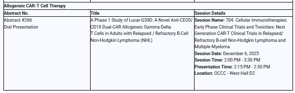 In addition to the CARVYKTI data, the Company will also deliver an oral presentation on Lucar-G39D, its investigational and novel anti-CD20/CD19 dual-CAR allogeneic gamma delta T cell therapy, being evaluated in patients with relapsed or refractory B-cell non-Hodgkin lymphoma (NHL).