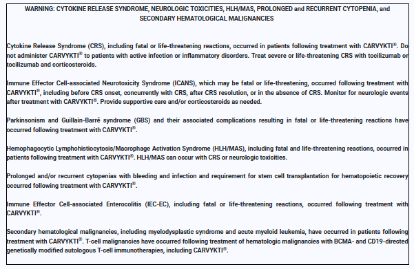 SECONDARY MALIGNANCIES: Patients treated with CARVYKTI® may develop secondary malignancies. Among patients receiving CARVYKTI® in the CARTITUDE-1 & -4 studies, myeloid neoplasms occurred in 5% (13/285) of patients (9 cases of myelodysplastic syndrome, 3 cases of acute myeloid leukemia, and 1 case of myelodysplastic syndrome followed by acute myeloid leukemia). The median time to onset of myeloid neoplasms was 447 days (range: 56 to 870 days) after treatment with CARVYKTI®. Ten of these 13 patients died following the development of myeloid neoplasms; 2 of the 13 cases of myeloid neoplasm occurred after initiation of subsequent antimyeloma therapy. Cases of myelodysplastic syndrome and acute myeloid leukemia have also been reported in the post marketing setting. T-cell malignancies have occurred following treatment of hematologic malignancies with BCMA- and CD19-directed genetically modified autologous T-cell immunotherapies, including CARVYKTI®. Mature T-cell malignancies, including CAR-positive tumors, may present as soon as weeks following infusions, and may include fatal outcomes.