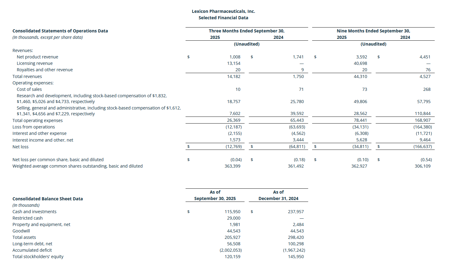Cash, Investments, and Restricted Cash: As of September 30, 2025, Lexicon had $145.0 million in cash and investments including $29 million in restricted cash, as compared to $238.0 million in cash and investments as of December 31, 2024.