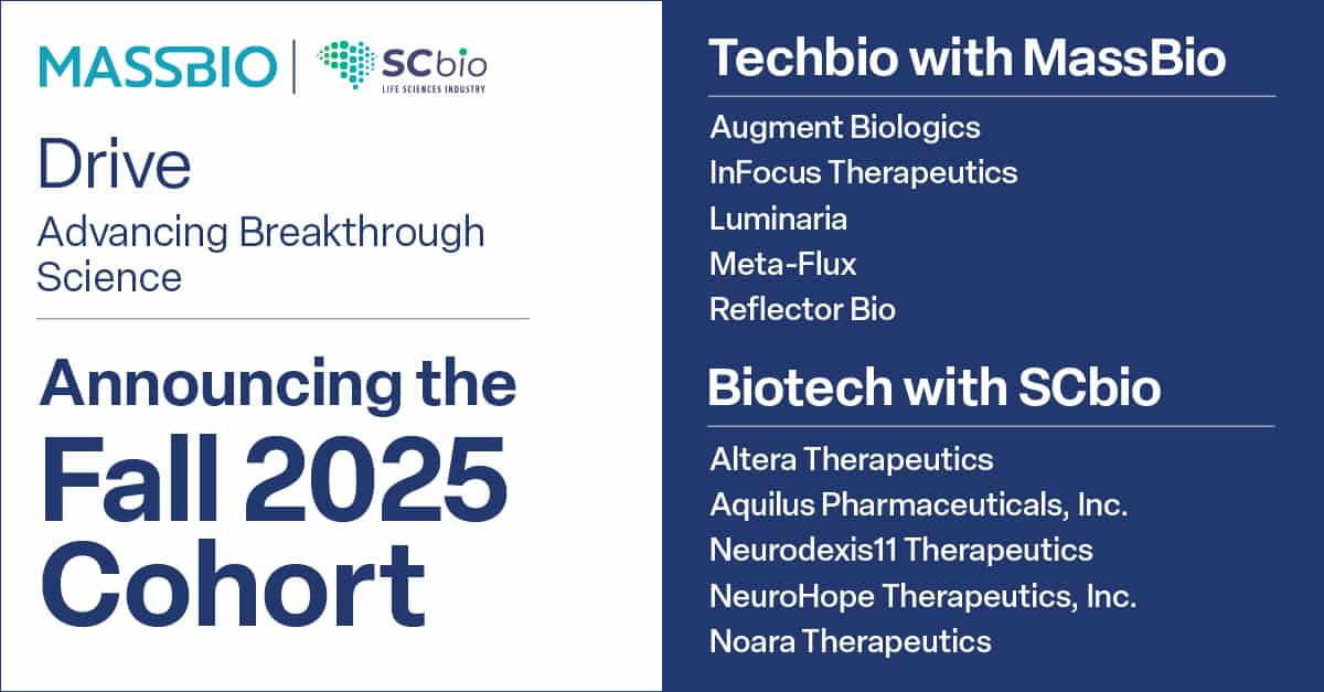 As part of Drive’s expanded national strategy to resource emerging startups wherever they are based, two parallel cohorts will launch this fall: a biotech cohort powered by SCbio and a techbio cohort powered by MassBio. The biotech cohort features startups tackling some of the most pressing therapeutic challenges in immunology, neuroscience, and oncology, while the techbio cohort features cutting-edge technologies shaping the future of drug discovery, design, and development, from AI and machine learning to 3D modeling, bioinformatics, and advanced data analytics.