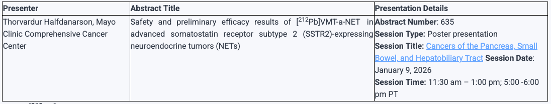 Perspective Therapeutics announced that updated safety and preliminary efficacy data from its [212Pb]VMT-α-NET program in advanced SSTR2-expressing neuroendocrine tumors have been accepted for presentation at the ASCO Gastrointestinal Cancers Symposium 2026.